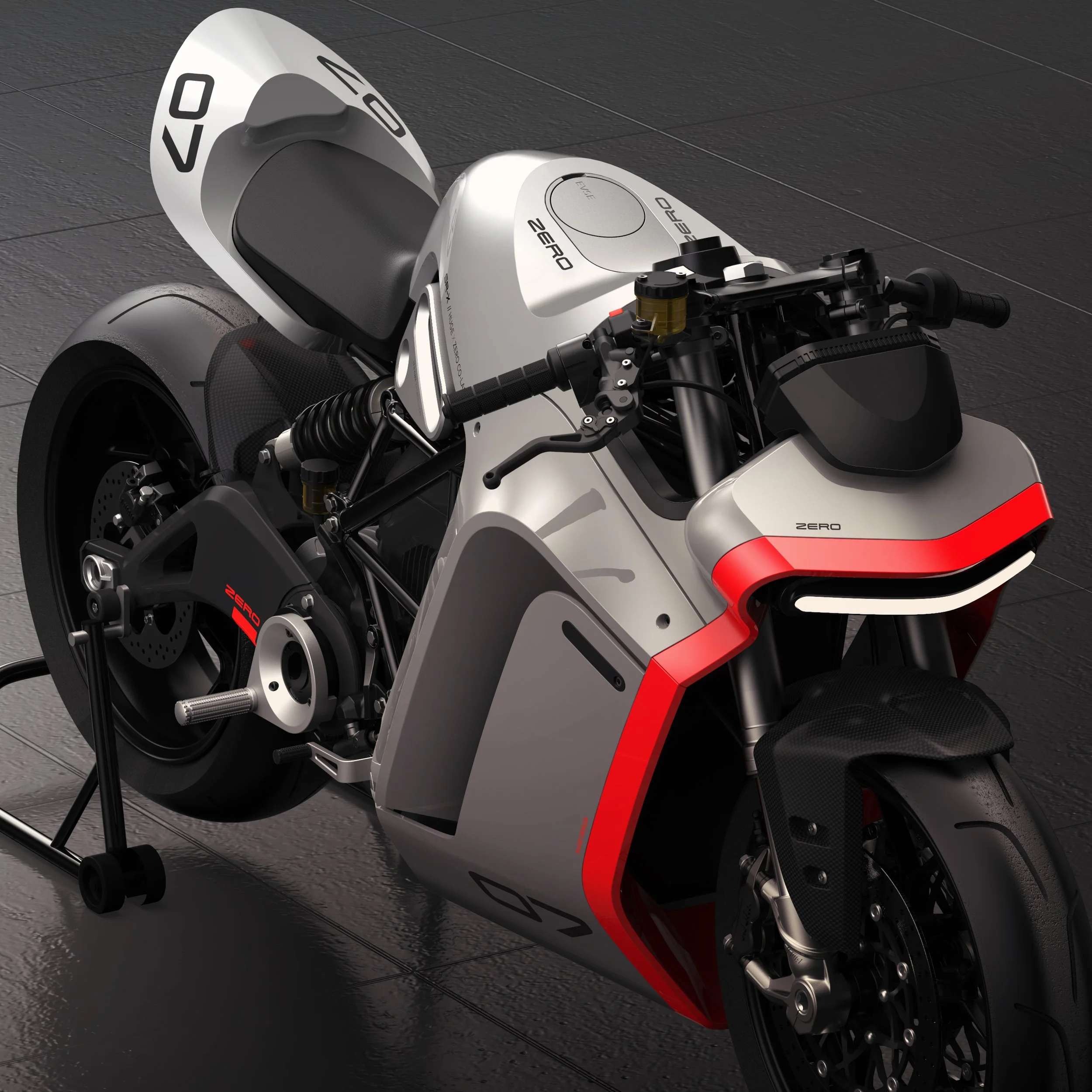 After expressing our interest in building a concept bike around their latest SR-F/S chassis, we received full support and help from Zero. Once we received the fully-functional SRS production bike as our starting point, our main desire was to be given our ‘mojo time’ to come up with a basic design concept that would take full advantage of amazing Zero chassis/drivetrain. After a few innocent burnouts and test rides of the high performance prototype, the concept that resonated was an updated interpretation of an earlier Hugemoto design, the ‘Mono Racr’. The chassis was a perfect fit for this basic direction, a fully aero front half contrasted by the exposed raw mechanical back half.